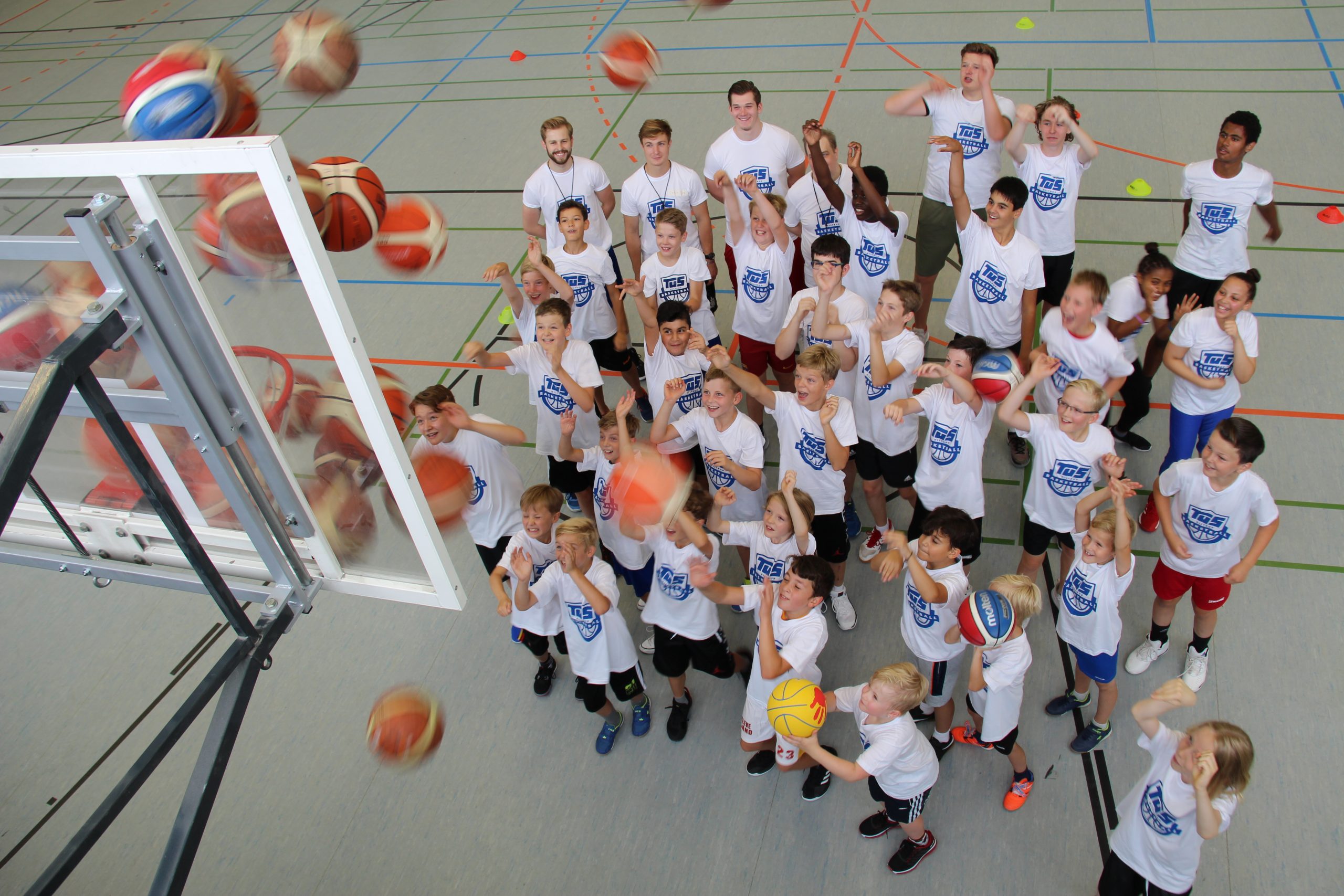Gruppenbild Basketballdcamp: Jugendliche in Turnhalle mit Basektbällen