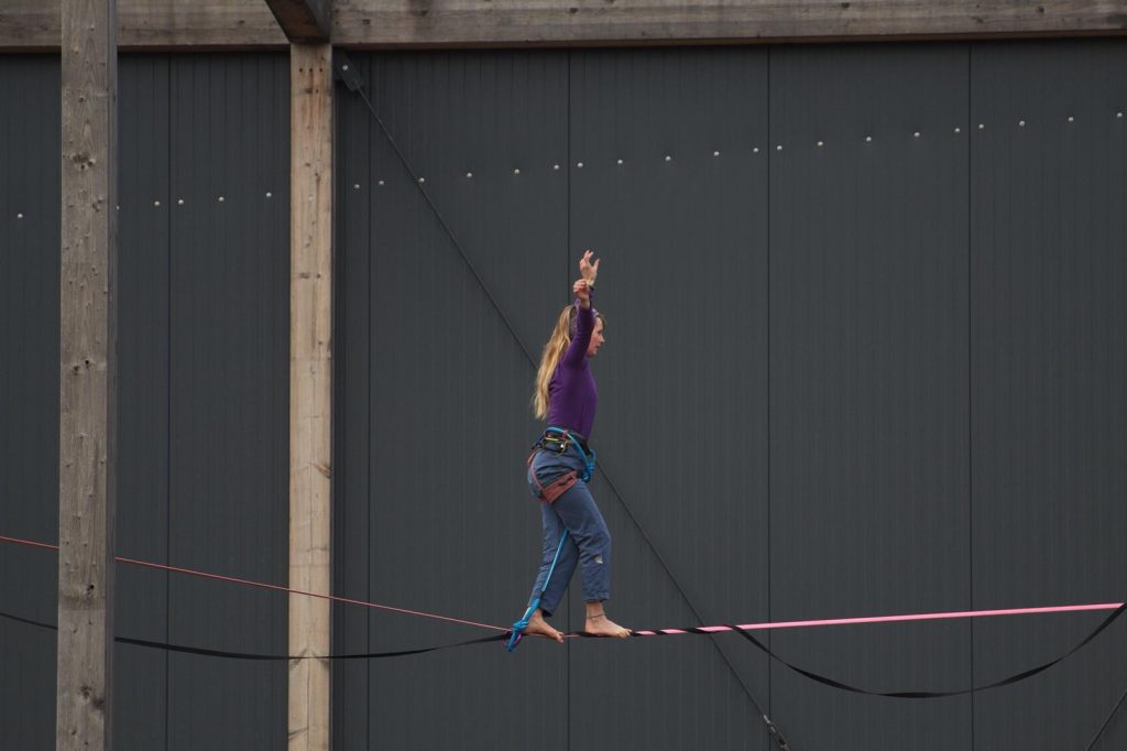 Im Gegensatz zum klassischen Slacklinen verläuft die Line hier in großer Höhe. Sie bewegt sich dynamisch nach oben, unten und zur Seite – und fordert dabei volle Konzentration. Wer das Gleichgewicht verliert, erlebt für einen kurzen Moment das Gefühl des freien Falls, bevor die Sicherung greift. Genau dieser Mix aus Nervenkitzel, Körperkontrolle und mentaler Stärke macht den Reiz dieses besonderen Sports aus.